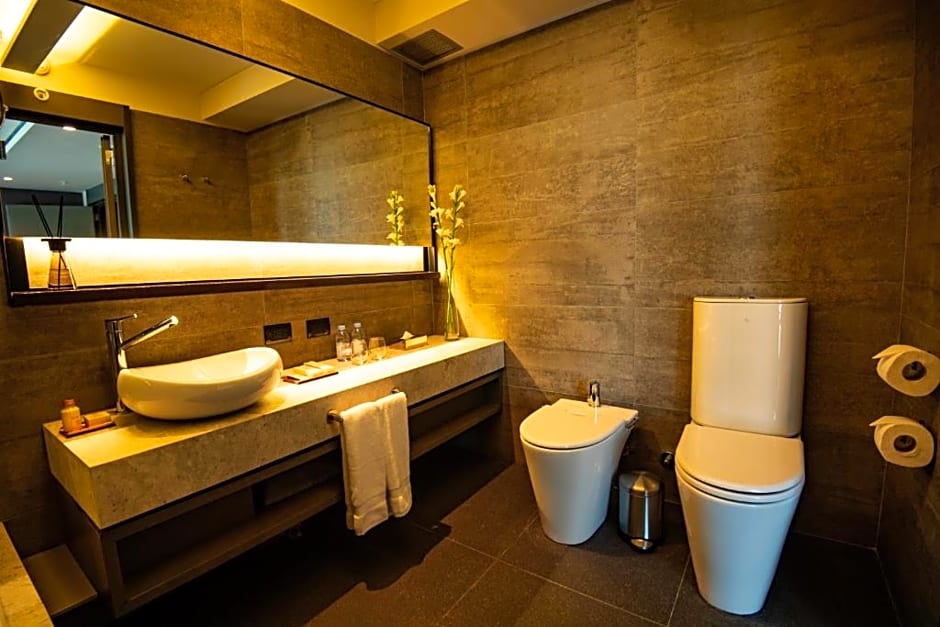 Facilities include a Restaurant and an Indoor swimming pool (free), plus free Wifi, Room service, and a Fitness center (free). Streaming service (like Netflix), Bar, Sun deck, and Terrace add leisure options, while a 24-hour front desk, Non-smoking rooms, and Wheelchair accessible accommodations ensure comfort. Landmark view and Upper floors accessible by elevator enhance the stay. Parking options include Private Parking (extra charges) and Parking On Site (extra charges). Extras such as Meeting/Banquet facilities (extra charges), Spa (extra charges), and Massage (extra charges) are also available. An Airport shuttle (free) is offered, along with Sauna. Free toiletries, Bidet, and Bathtub are provided.